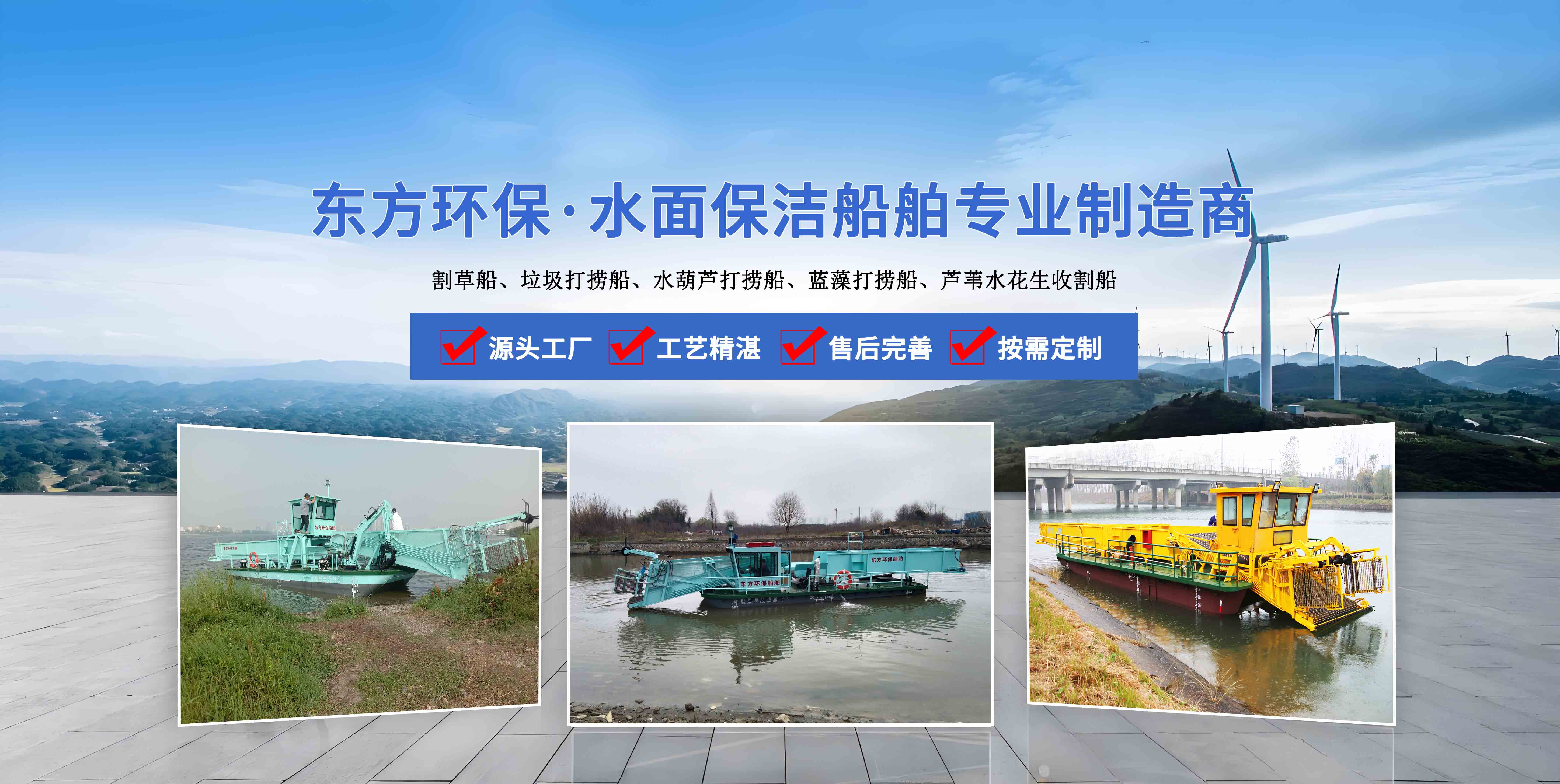 青州市東方環(huán)保機械制造有限公司位于山東省青州市,地理位置得天獨厚,是水面保潔船、水草收割船、、清漂船、滸苔打撈船、藍藻打撈船等水面船體的專業(yè)制造銷售廠家, 公司成立于2006年,公司先后與山東省黃河造船廠、中船重工702研究所、青島海洋大學、渤海船舶職業(yè)學院等機構(gòu)建立了長期合作關(guān)系.。